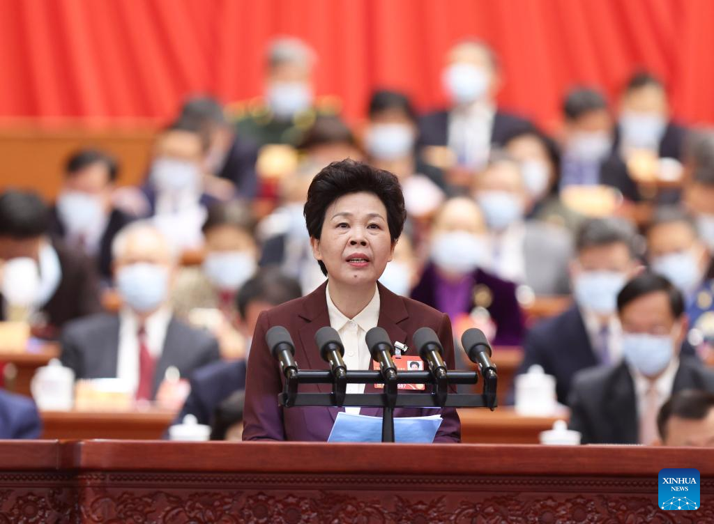 Tian Qinxin, a member of the 13th National Committee of the Chinese People's Political Consultative Conference (CPPCC), delivers a speech at the second plenary meeting of the fifth session of the 13th CPPCC National Committee at the Great Hall of the People in Beijing, capital of China, March 7, 2022. (Xinhua/Li Xiang)