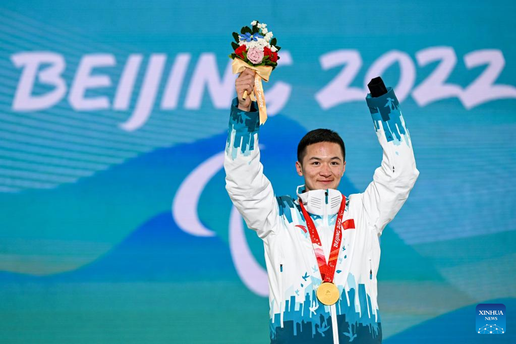 Gold medalist Ji Lijia of China poses for photos during the awarding ceremony for Para Snowboard Men's Snowboard Cross SB-UL event of Beijing 2022 Paralympic Winter Games at Zhangjiakou Medals Plaza in Zhangjiakou, north China's Hebei Province, March 7, 2022. (Xinhua/Hu Chao)