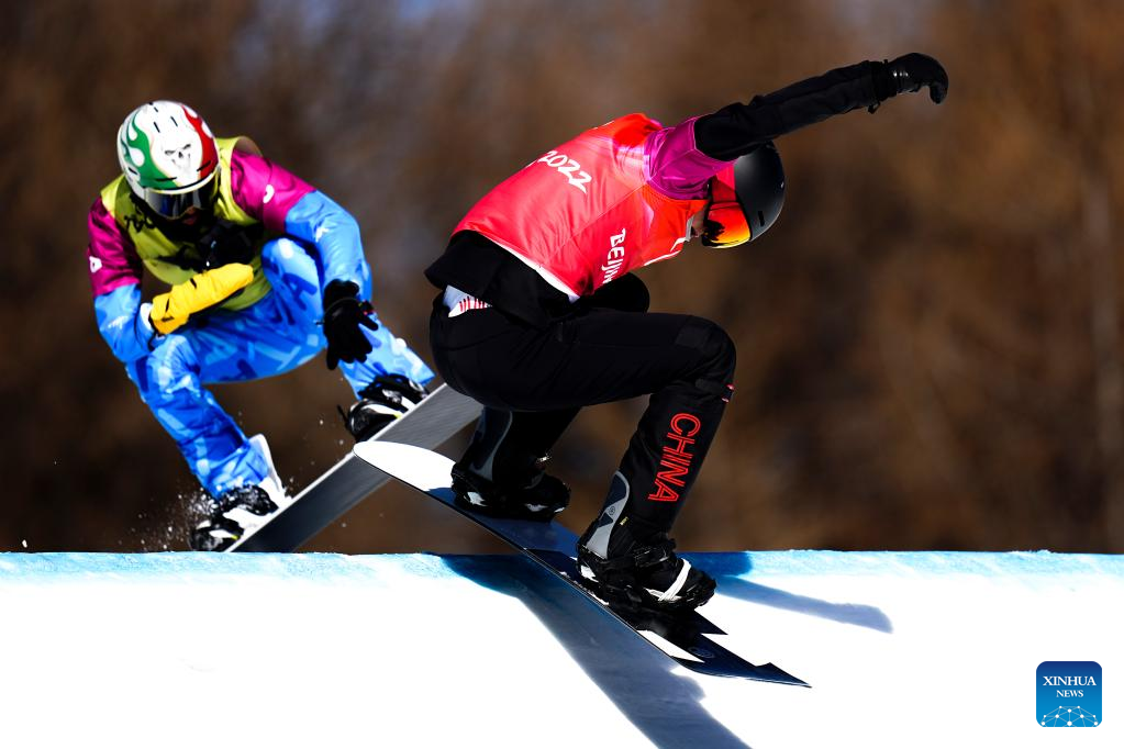Ji Lijia of China competes during the Para Snowboard Men's Snowboard Cross SB-UL quarterfinal of Beijing 2022 Winter Paralympic Games at Genting Snow Park in Zhangjiakou, north China's Hebei Province, March 7, 2022. (Xinhua/Lan Hongguang)