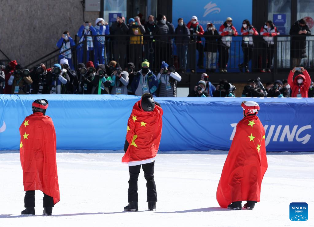 Ji Lijia (C), Wang Pengyao (L) and Zhu Yonggang of China celebrate after the Para Snowboard Men's Cross UL event of Beijing 2022 Winter Paralympic Games at Genting Snow Park in Zhangjiakou, north China's Hebei Province, March 7, 2022. (Xinhua/Mu Yu)