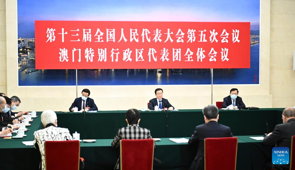 Chinese Vice Premier Han Zheng, also a member of the Standing Committee of the Political Bureau of the Communist Party of China Central Committee, attends a deliberation of Macao delegation at the fifth session of the 13th National People's Congress (NPC) in Beijing, capital of China, March 7, 2022. (Xinhua/Yan Yan)