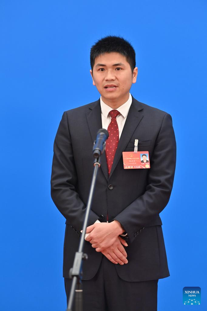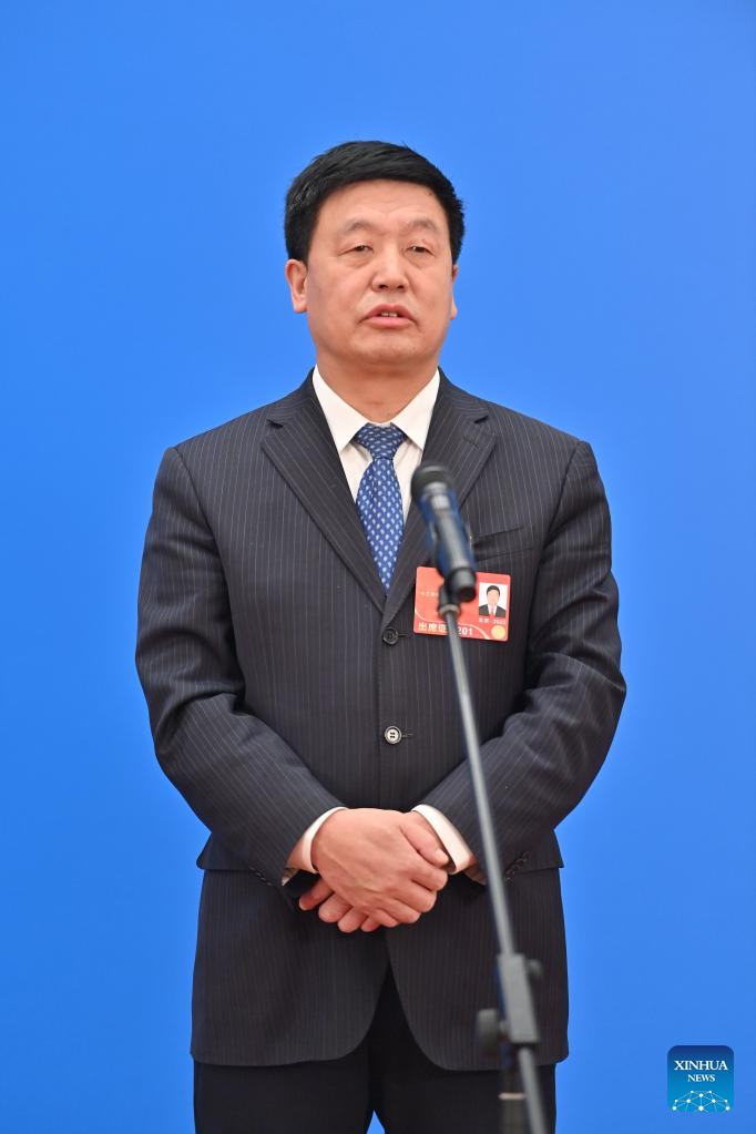 Li Hongliang, a deputy to the 13th National People's Congress (NPC), attends an interview via video link ahead of the second plenary meeting of the fifth session of the 13th NPC in Beijing, capital of China, March 8, 2022. (Xinhua/Li Xin)