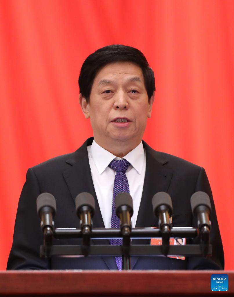 Li Zhanshu, chairman of the National People's Congress (NPC) Standing Committee, delivers a work report of the NPC Standing Committee to the second plenary meeting of the fifth session of the 13th NPC at the Great Hall of the People in Beijing, capital of China, March 8, 2022. (Xinhua/Liu Weibing)