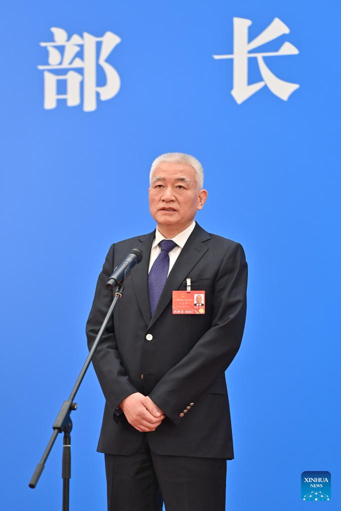 Chinese Minister of Water Resources Li Guoying attends an interview via video link after the second plenary meeting of the fifth session of the 13th National People's Congress (NPC) in Beijing, capital of China, March 8, 2022. (Xinhua/Chen Zhonghao)