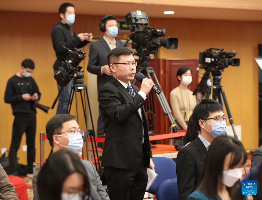 A journalist asks questions via video link in an interview attended by ministers after the second plenary meeting of the fifth session of the 13th National People's Congress (NPC) in Beijing, capital of China, March 8, 2022. (Xinhua/Yin Gang)