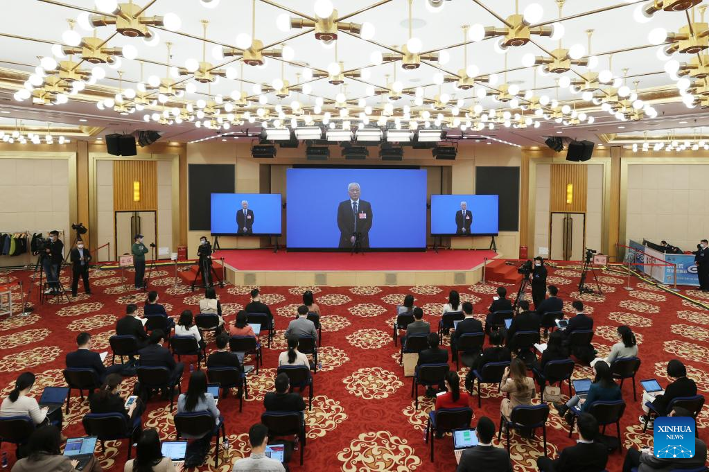 Chinese Minister of Science and Technology Wang Zhigang attends an interview via video link after the second plenary meeting of the fifth session of the 13th National People's Congress (NPC) in Beijing, capital of China, March 8, 2022. (Xinhua/Li Xin)