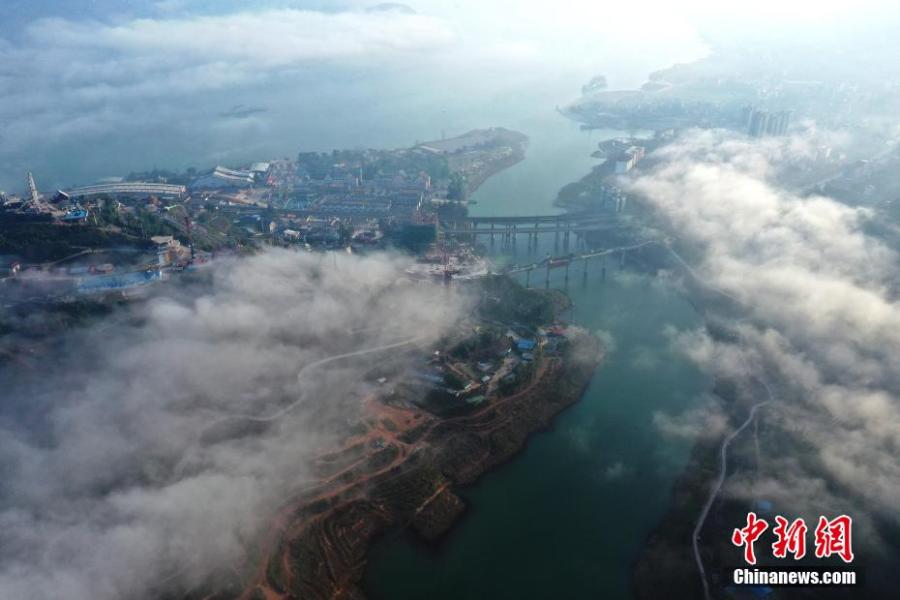 Beautiful landscape of the Wine Town shrouded in heavy advection fog near the Yangtze River in Fuling district, Chongqing, March 8, 2022. (Photo: China News Service/Yang Xiaoyong)