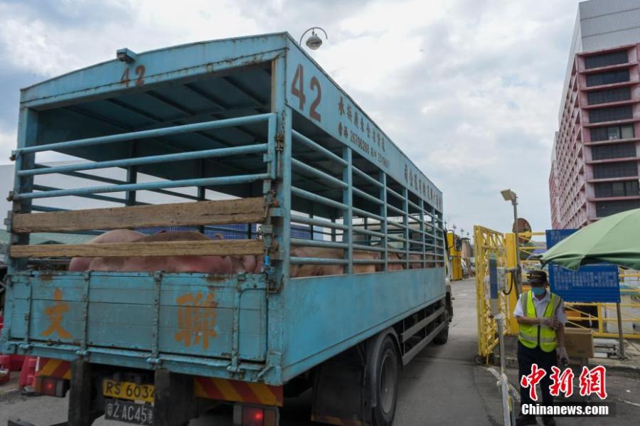 A truck carrying pigs arrives at Sheng Shui Slaughterhouse, the Hong Kong Special Administrative Region, March 7, 2022. (Photo: China News Service/Chen Yongnuo)