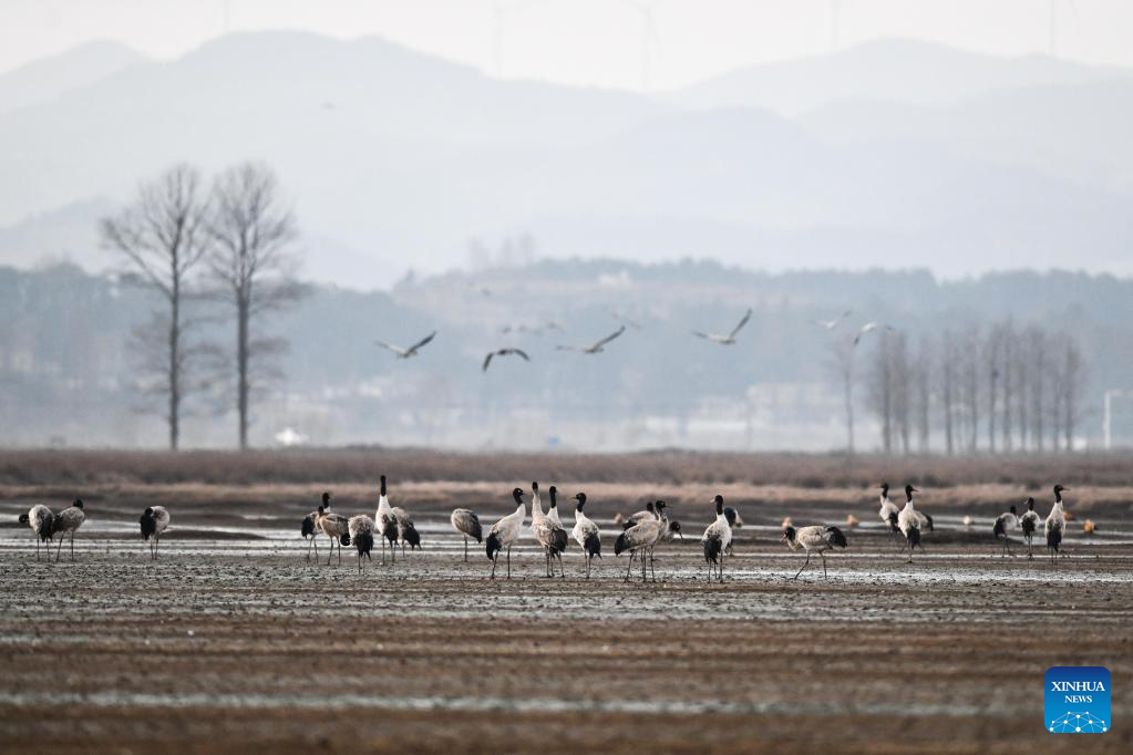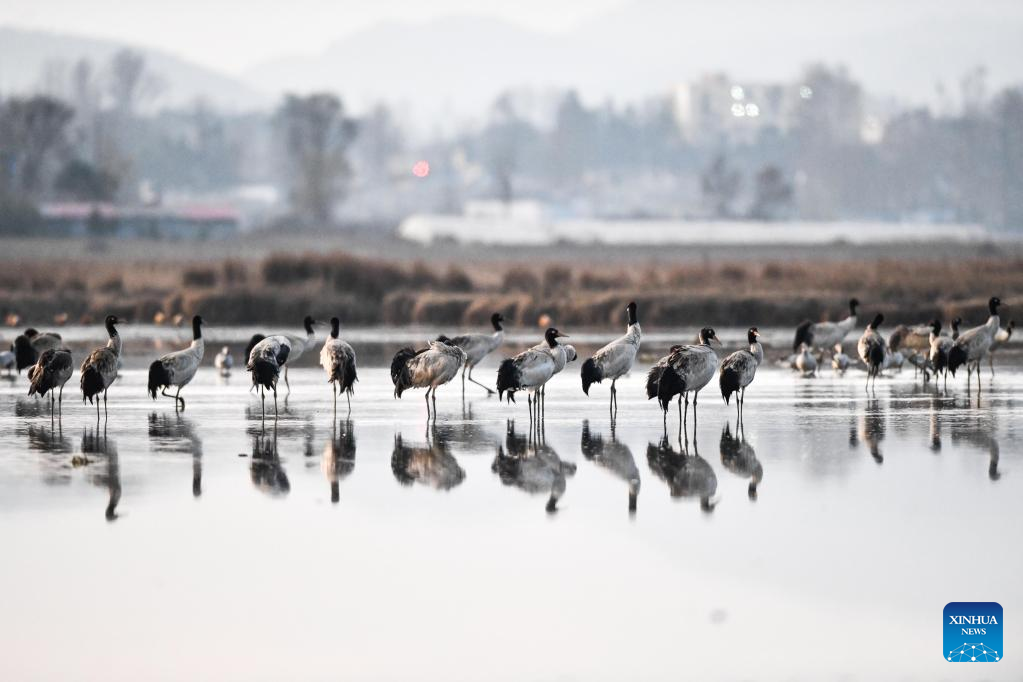 Black-necked cranes and other migrant birds are seen at the Caohai National Nature Reserve in Weining Yi, Hui and Miao Autonomous County, southwest China's Guizhou Province, March 8, 2022. (Xinhua/Yang Wenbin)