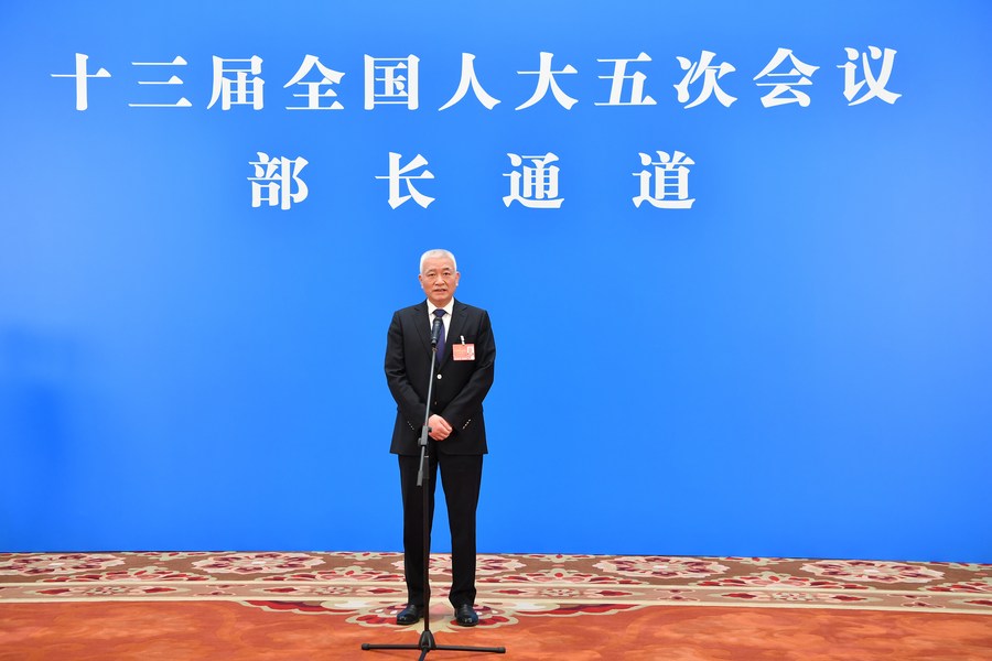 Chinese Minister of Science and Technology Wang Zhigang attends an interview via video link after the second plenary meeting of the fifth session of the 13th National People's Congress (NPC) in Beijing, capital of China, March 8, 2022. (Xinhua/Li Xin)