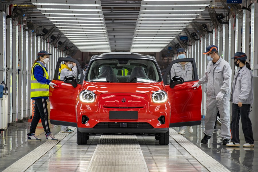 Workers operate at the final assembly workshop of an automobile company in the new energy vehicle town of Jinhua City, east China's Zhejiang Province, Dec. 17, 2021. (Xinhua/Hu Xiaofei)