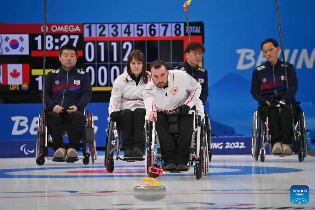 Jon Thurston (C) of Canada competes during the Wheelchair Curling Round Robin Match between South Korea and Canada of Beijing 2022 Winter Paralympics at National Aquatics Center in Beijing, capital of China, on March 8, 2022. (Xinhua/Wu Huiwo)