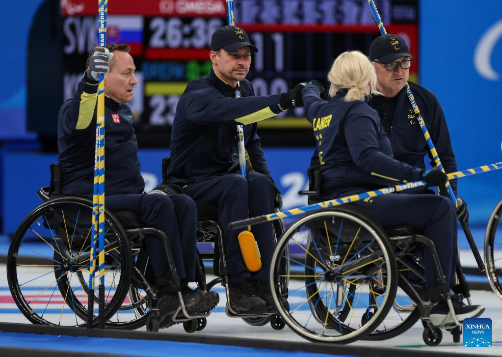 Team members of Sweden react during the Wheelchair Curling Round Robin Match between Sweden and Estonia of Beijing 2022 Winter Paralympics at National Aquatics Center in Beijing, capital of China, on March 8, 2022. (Xinhua/Zhang Keren)