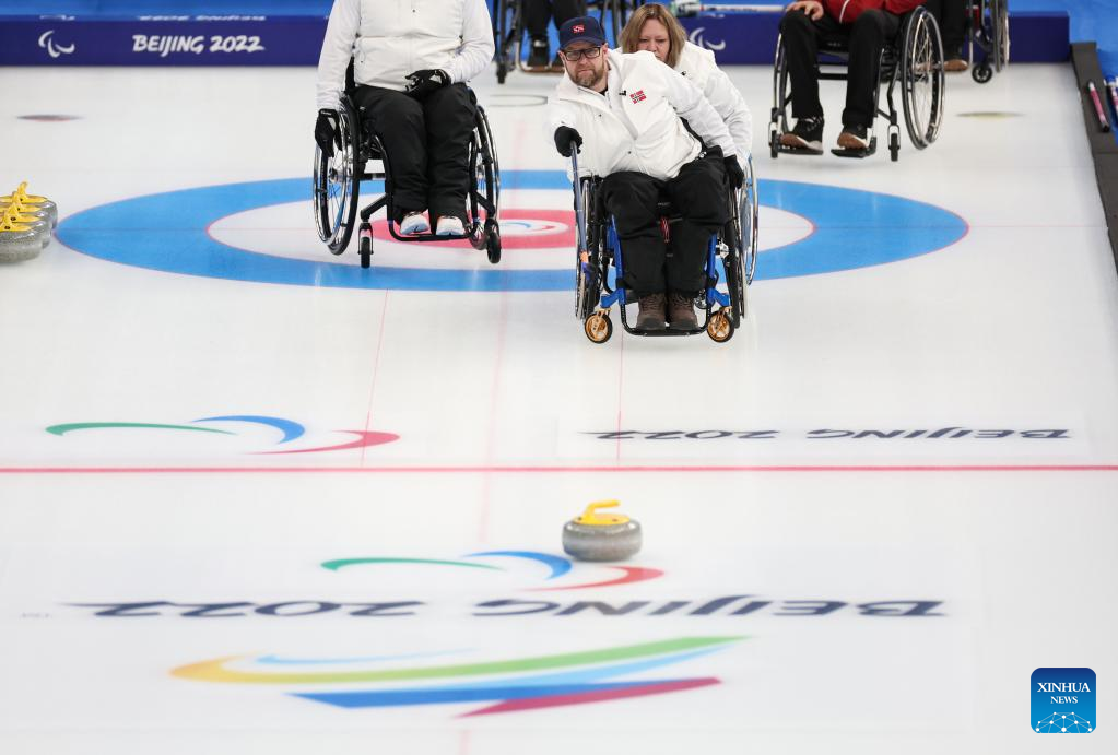 Geir Arne Skogstad (front) of Norway competes during the Wheelchair Curling Round Robin Match between Latvia and Norway of Beijing 2022 Winter Paralympics at National Aquatics Center in Beijing, capital of China, on March 8, 2022. (Xinhua/Zhang Keren)