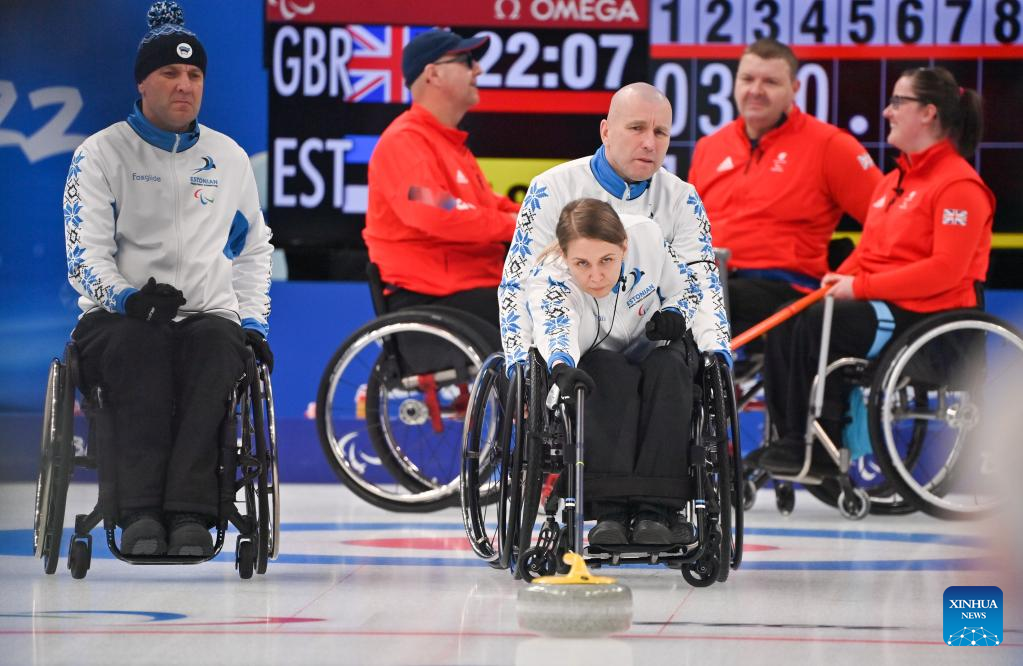 Katlin Riidebach (front) of Estonia competes during the Wheelchair Curling Round Robin Match between Britain and Estonia of Beijing 2022 Winter Paralympics at National Aquatics Center in Beijing, capital of China, on March 8, 2022. (Xinhua/Wu Huiwo)