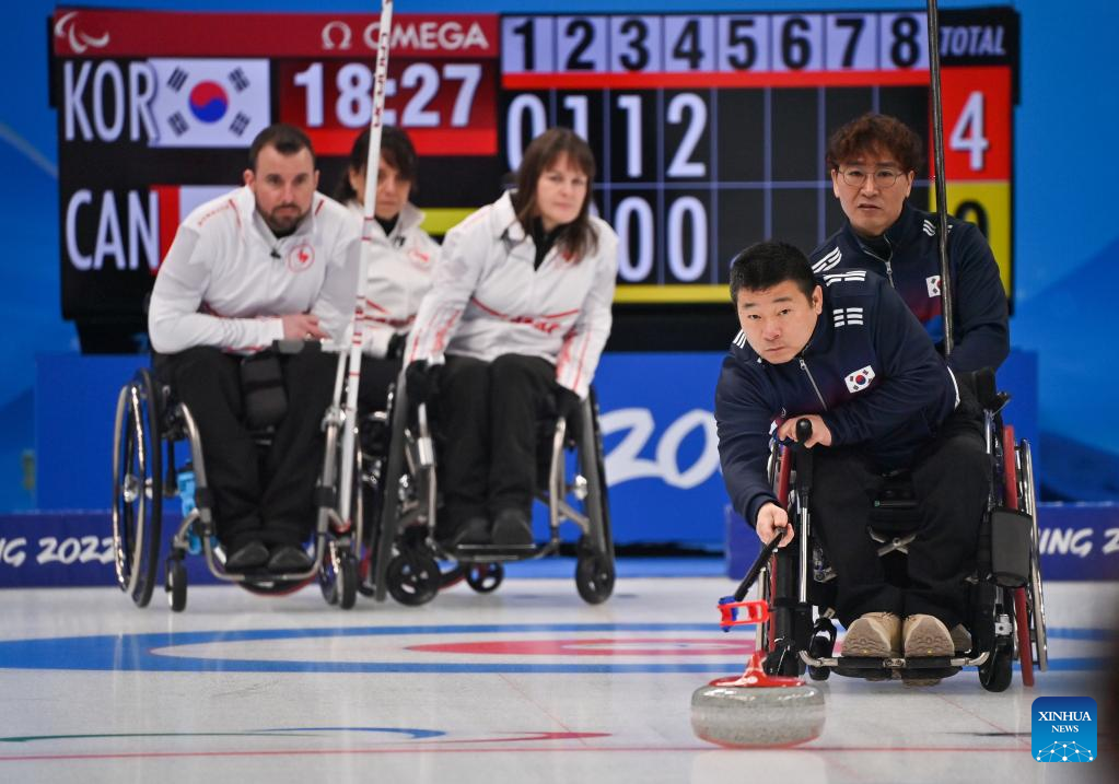 Jang Jaehyuk (2nd R) of South Korea competes during the Wheelchair Curling Round Robin Match between South Korea and Canada of Beijing 2022 Winter Paralympics at National Aquatics Center in Beijing, capital of China, on March 8, 2022. (Xinhua/Wu Huiwo)