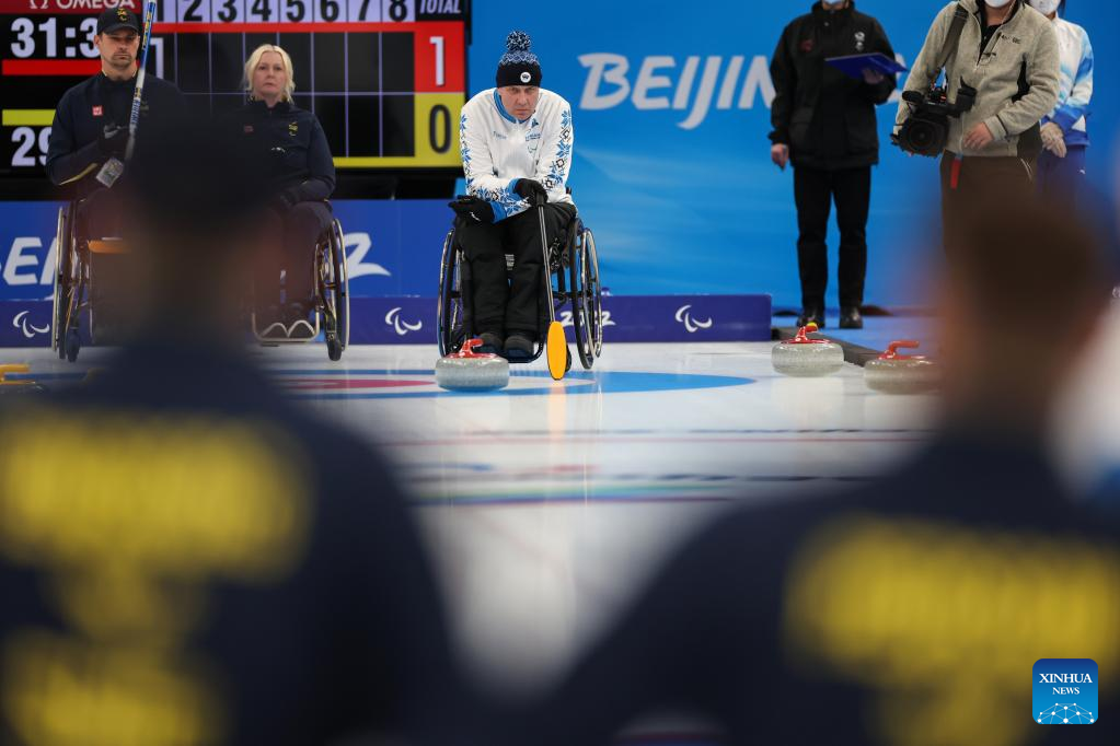Mait Matas of Estonia competes during the Wheelchair Curling Round Robin Match between Sweden and Estonia of Beijing 2022 Winter Paralympics at National Aquatics Center in Beijing, capital of China, on March 8, 2022. (Xinhua/Zhang Keren)