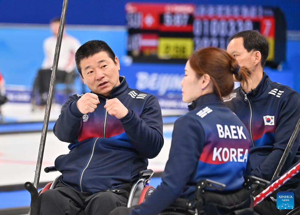 Jang Jaehyuk (L) of South Korea reacts during the Wheelchair Curling Round Robin Match between South Korea and Canada of Beijing 2022 Winter Paralympics at National Aquatics Center in Beijing, capital of China, on March 8, 2022. (Xinhua/Wu Huiwo)