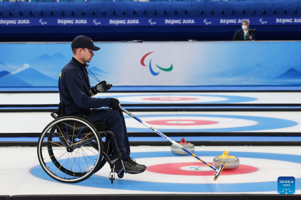 Viljo Pettersson-Dahl of Sweden competes during the Wheelchair Curling Round Robin Match between Sweden and Estonia of Beijing 2022 Winter Paralympics at National Aquatics Center in Beijing, capital of China, on March 8, 2022. (Xinhua/Zhang Keren)