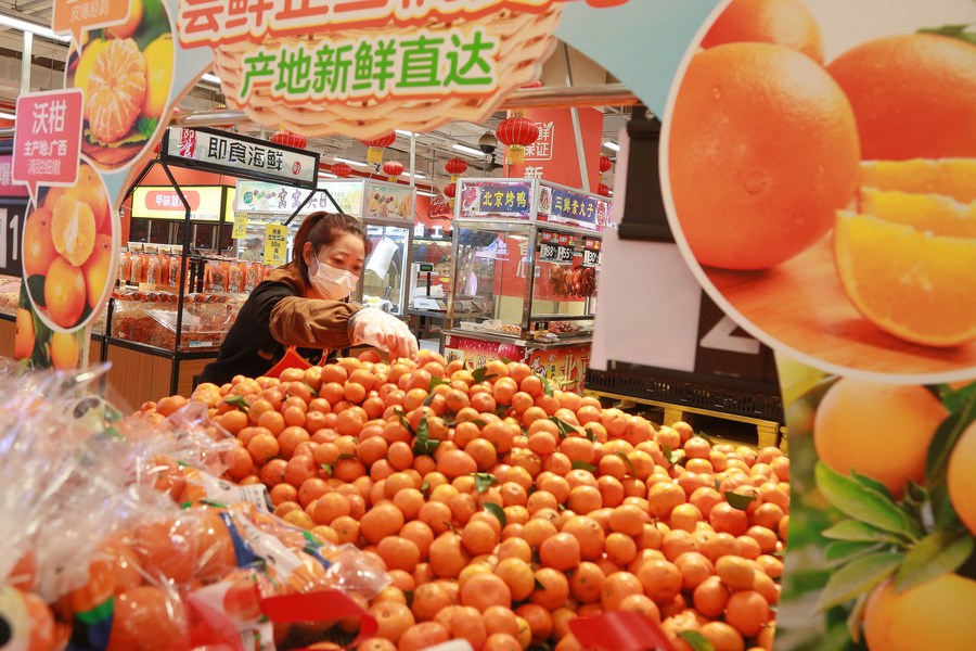A staff member works at a supermarket in Bijie, southwest China's Guizhou Province, Feb. 16, 2022. (Photo by Wang Chunliang/Xinhua)