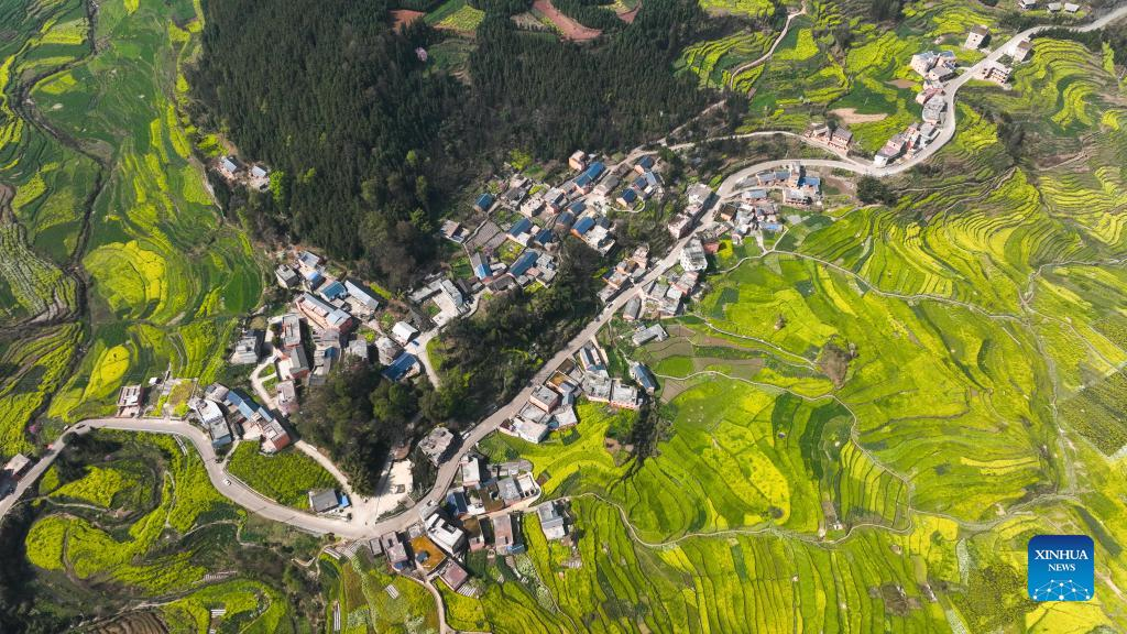 Aerial photo taken on March 7, 2022 shows the scenery of cole flower fields in Panzhou, southwest China's Guizhou Province. In the process of consolidating poverty alleviation achievements and promoting rural revitalization, Guizhou has actively guided farmers to change farming methods and develop suitable agriculture industry in mountainous areas. At the same time, Guizhou made efforts to integrate agriculture with tourism and cultural industries, which helped to increase agricultural efficiency and farmers' income. (Xinhua/Yang Wenbin)