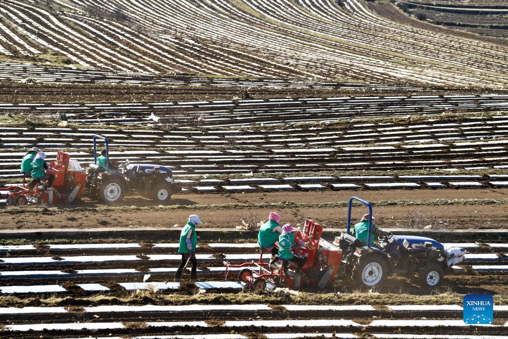 Farmers work in the fields in Weining, southwest China's Guizhou Province, March 8, 2022. In the process of consolidating poverty alleviation achievements and promoting rural revitalization, Guizhou has actively guided farmers to change farming methods and develop suitable agriculture industry in mountainous areas. At the same time, Guizhou made efforts to integrate agriculture with tourism and cultural industries, which helped to increase agricultural efficiency and farmers' income. (Xinhua/Yang Wenbin)
