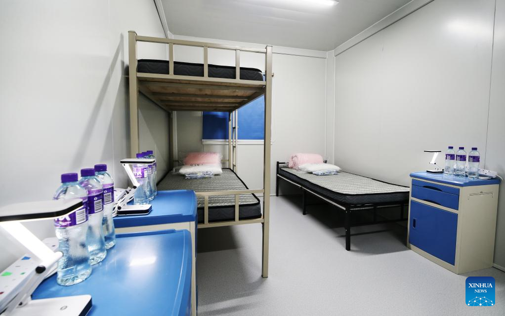 Photo taken on March 8, 2022 shows an isolation room of a community isolation facility (CIF) in San Tin Tsuen Road, Yuen Long, south China's Hong Kong. The second community isolation facility (CIF) in Hong Kong constructed with the support from the mainland will start operation after it was handed over to the Hong Kong Special Administrative Region (HKSAR) government on Wednesday. (Xinhua)