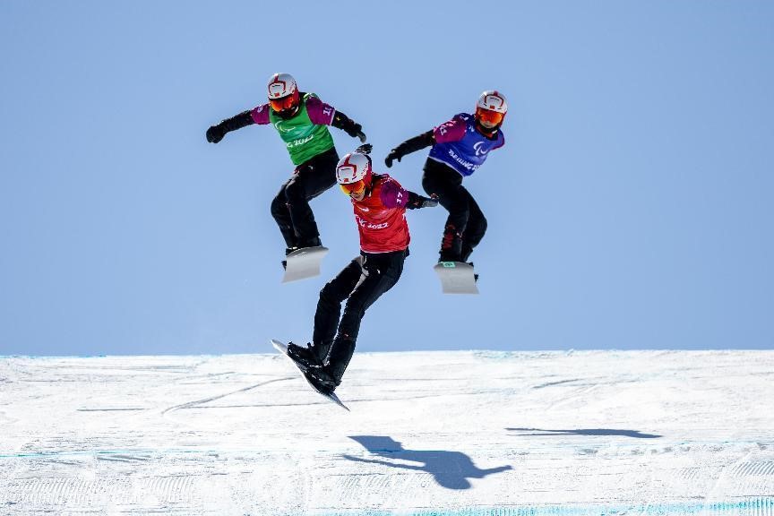 Three Chinese athletes compete in the Para snowboard men's cross SB-UL event at the Beijing 2022 Winter Paralympic Games, March 7, 2022. (People's Daily Online/Weng Qiyu)