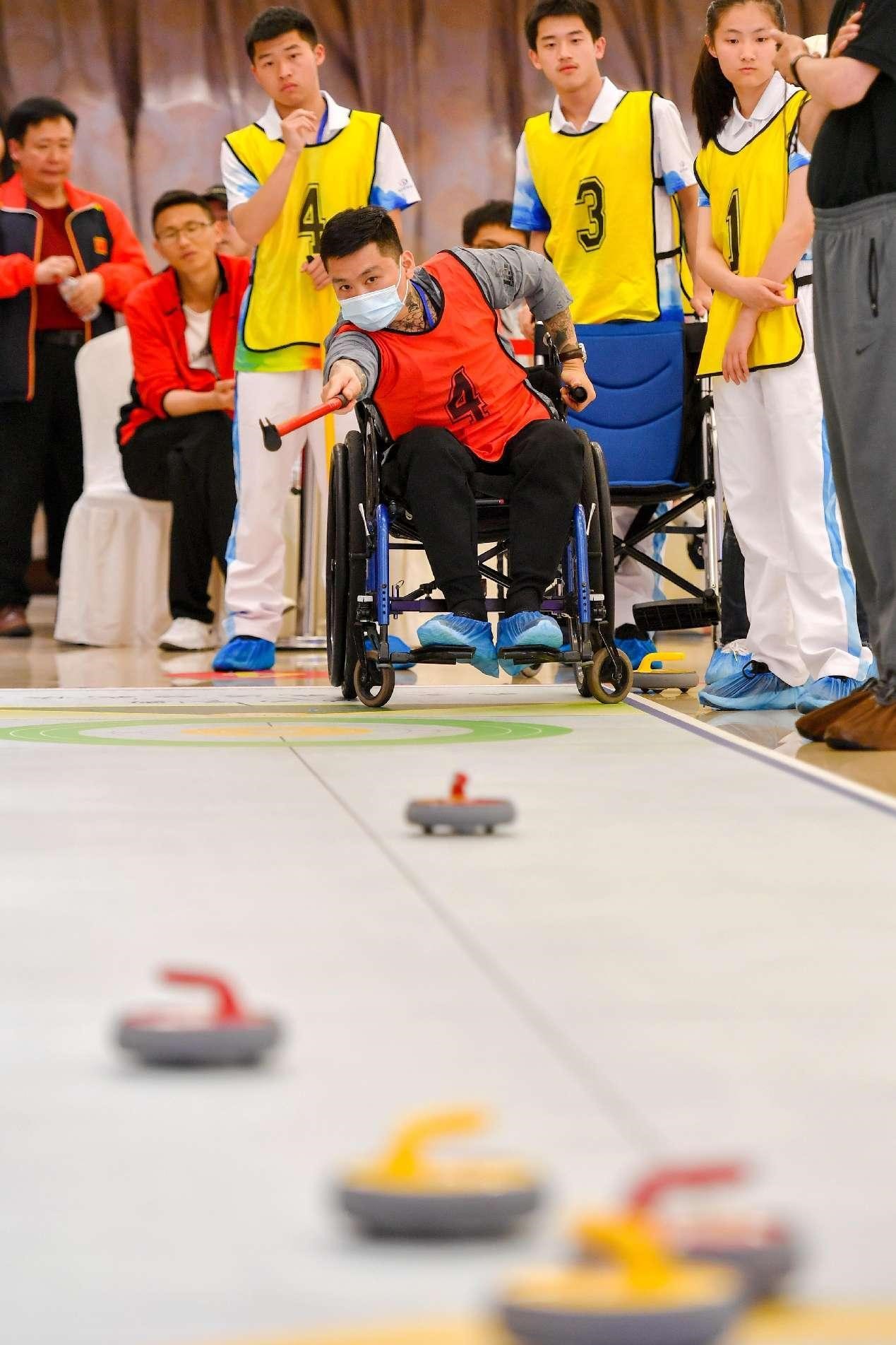 A curling game for disabled people is held at a sports base in Changxing county, Huzhou, east China's Zhejiang province, April 29, 2021. (People's Daily Online/Tan Yunfeng)