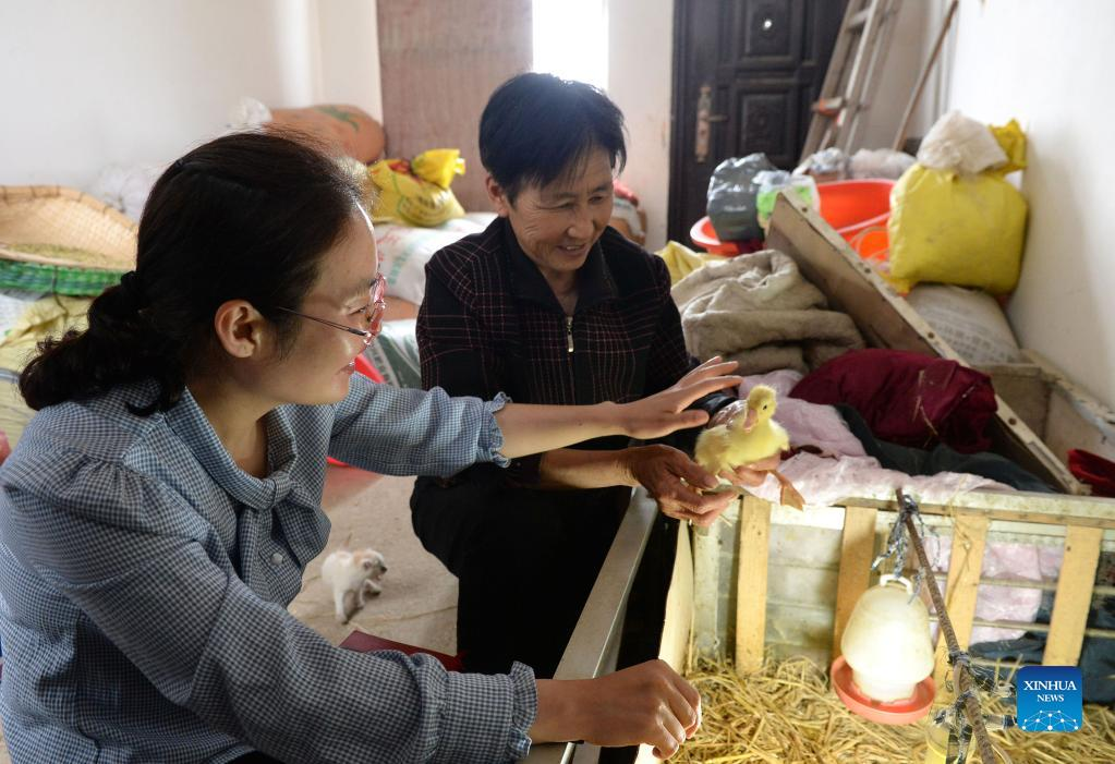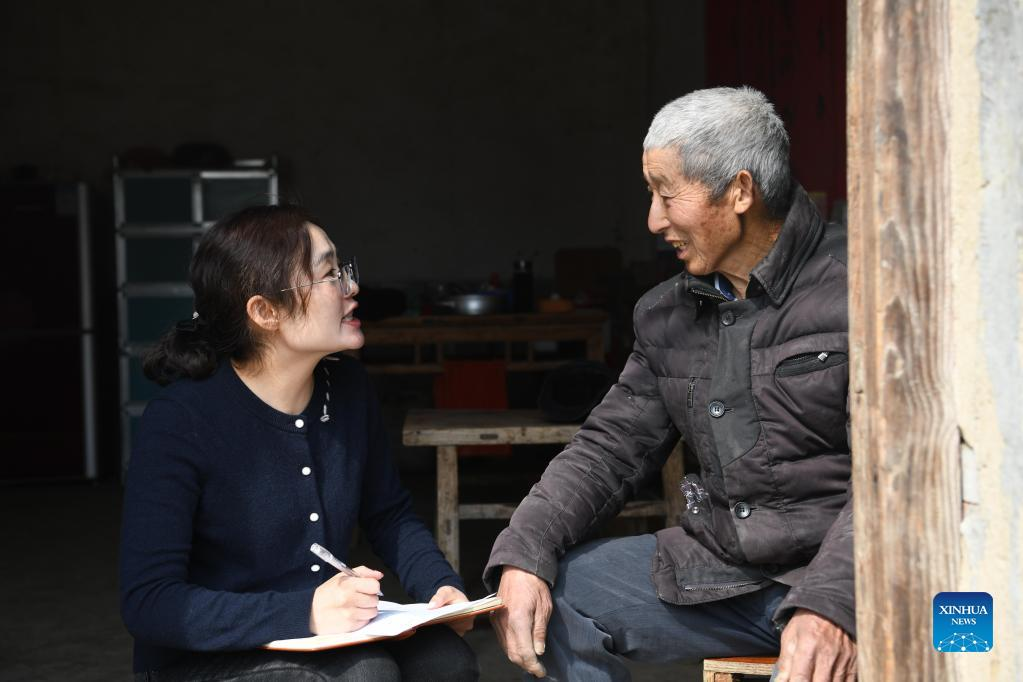 Wang Mengmeng (L) visits a farmer in Wuwei Township of Dingyuan County, east China's Anhui Province, Feb. 22, 2022. Wang Mengmeng, a village official in east China's Anhui Province since 2013 when she began serving in her post after graduating from university, led the village in developing specialty agriculture to cash in on the region's transport and location advantages. After taking on her duties as a deputy to the National People's Congress in 2018, Wang has carried out multiple surveys on the methods of rural vitalization. The suggestions Wang put forward at China's ongoing "two sessions" focus on the long-term development pattern of rural collective economy. (Xinhua/Zhang Duan)