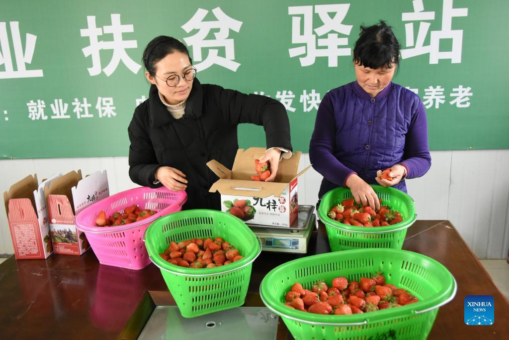 Wang Mengmeng (L) packs newly-picked strawberries with a farmer in Dingyuan County, east China's Anhui Province, Feb. 27, 2018. Wang Mengmeng, a village official in east China's Anhui Province since 2013 when she began serving in her post after graduating from university, led the village in developing specialty agriculture to cash in on the region's transport and location advantages. After taking on her duties as a deputy to the National People's Congress in 2018, Wang has carried out multiple surveys on the methods of rural vitalization. The suggestions Wang put forward at China's ongoing "two sessions" focus on the long-term development pattern of rural collective economy. (Photo by Feng Zailei/Xinhua)