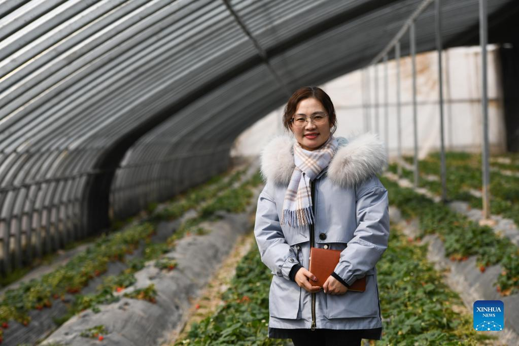 Wang Mengmeng poses for a photo in a strawberry greenhouse in Wuwei Township of Dingyuan County, east China's Anhui Province, Feb. 22, 2022. Wang Mengmeng, a village official in east China's Anhui Province since 2013 when she began serving in her post after graduating from university, led the village in developing specialty agriculture to cash in on the region's transport and location advantages. After taking on her duties as a deputy to the National People's Congress in 2018, Wang has carried out multiple surveys on the methods of rural vitalization. The suggestions Wang put forward at China's ongoing "two sessions" focus on the long-term development pattern of rural collective economy. (Xinhua/Zhang Duan)