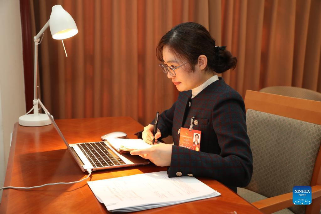 Wang Mengmeng works in the accommodation of deputies from Anhui Province to the National People's Congress, in Beijing, capital of China, March 6, 2022. Wang Mengmeng, a village official in east China's Anhui Province since 2013 when she began serving in her post after graduating from university, led the village in developing specialty agriculture to cash in on the region's transport and location advantages. After taking on her duties as a deputy to the National People's Congress in 2018, Wang has carried out multiple surveys on the methods of rural vitalization. The suggestions Wang put forward at China's ongoing "two sessions" focus on the long-term development pattern of rural collective economy. (Photo by Xu Guokang/Xinhua)