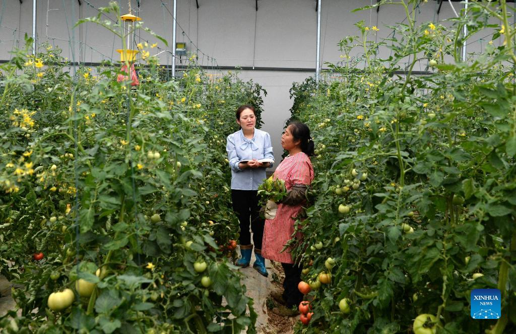 Wang Mengmeng (L) seeks suggestions on the development of poverty-relief base from a farmer in Xikong Village of Dingyuan County, east China's Anhui Province, May 8, 2020. Wang Mengmeng, a village official in east China's Anhui Province since 2013 when she began serving in her post after graduating from university, led the village in developing specialty agriculture to cash in on the region's transport and location advantages. After taking on her duties as a deputy to the National People's Congress in 2018, Wang has carried out multiple surveys on the methods of rural vitalization. The suggestions Wang put forward at China's ongoing "two sessions" focus on the long-term development pattern of rural collective economy. (Xinhua/Huang Bohan)