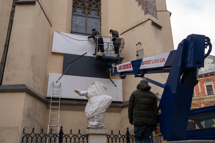 Workers install protections for a historic building in Lviv, Ukraine, March 8, 2022. (Xinhua/Ren Ke)