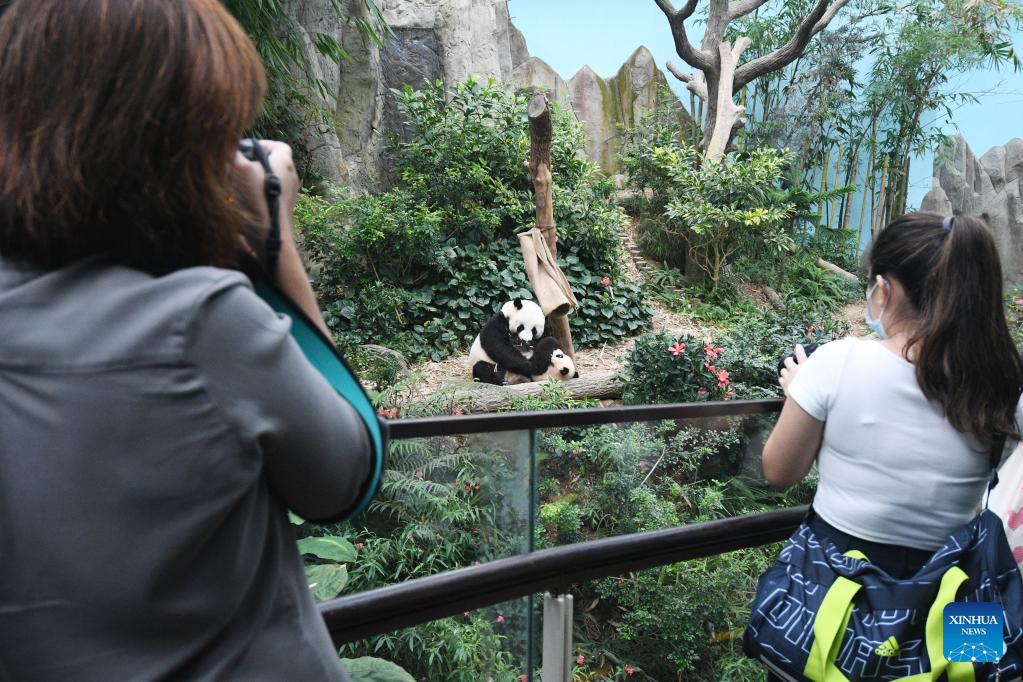 Giant panda cub Le Le is seen with its mother Jia Jia at the River Wonders in Singapore, March 10, 2022. (Photo by Then Chih Wey/Xinhua)
