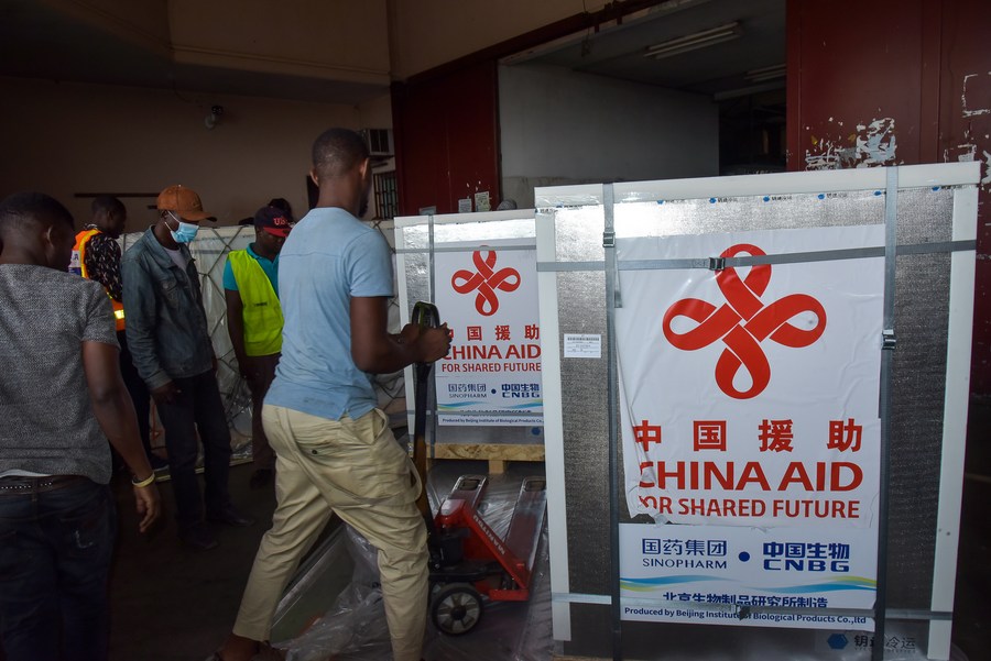 China-donated COVID-19 vaccines are transported at the Nsimalen airport in Yaounde, Cameroon, Dec. 14, 2021. (Photo by Kepseu/Xinhua)