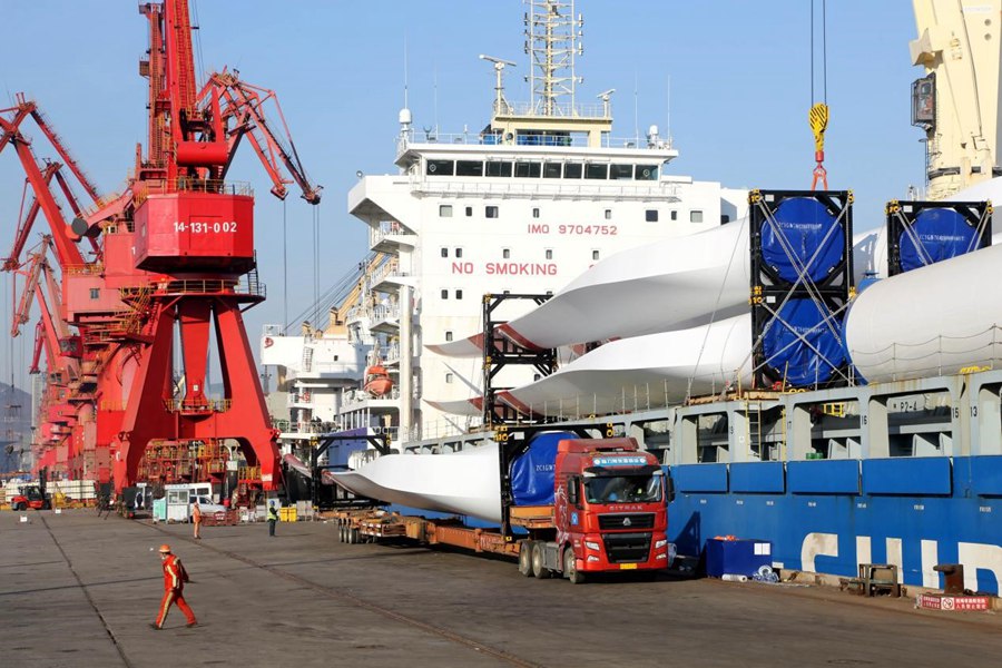 Wind turbines are loaded onto an ocean-going ship at a terminal in Lianyungang, east China's Jiangsu province, Dec. 31, 2021. (Photo by Wang Chun/People's Daily Online)