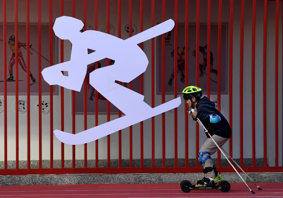 Li Yinuo, an athlete of cross-country skiing team, trains on the campus of Luanchuan County Special Education School in Luanchuan County, central China's Henan Province on Nov. 18, 2021. (Xinhua/Li An)