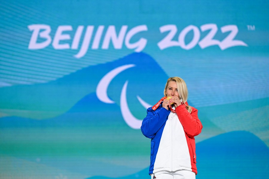 Gold medalist Cecile Hernandez of France kisses the medal during the award ceremony for Para Snowboard Women's Snowboard Cross SB-LL2 event of Beijing 2022 Paralympic Winter Games at Zhangjiakou Medals Plaza in Zhangjiakou, north China's Hebei Province on March 7, 2022. (Xinhua/Hu Chao)