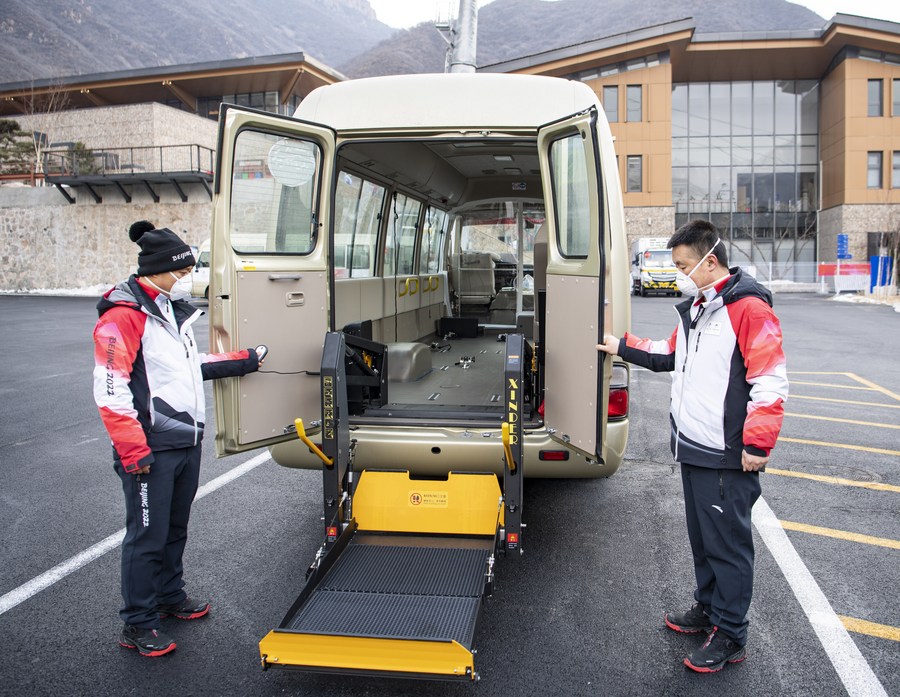Staff members show a barrier-free van at China's National Alpine Skiing Center in Yanqing District, Beijing on Feb. 28, 2022. (Xinhua/Sun Fei)