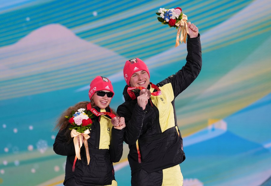 Bronze medalist Leonie Maria Walter (L) of Germany celebrate with her guide Pirmin Strecker during the awarding ceremony of the Para Biathlon Women's Individual Vision Impaired event of Beijing 2022 Winter Paralympic Games at National Biathlon Center in Zhangjiakou, north China's Hebei Province, March 11, 2022. (Xinhua/Zhao Zishuo)