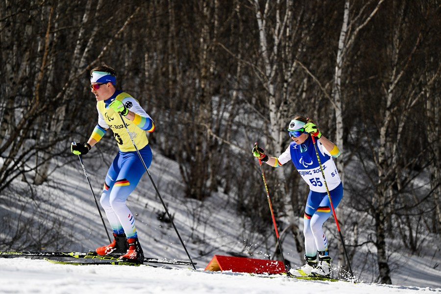 Linn Kazmaier (R) of Germany, together with her guide Florian Baumann, competes during the Para Cross-Country Skiing Women's Middle Distance Vision Impaired final of Beijing 2022 Winter Paralympics at National Biathlon Center in Zhangjiakou, north China's Hebei Province, March 12, 2022. (Xinhua/Xue Yuge)