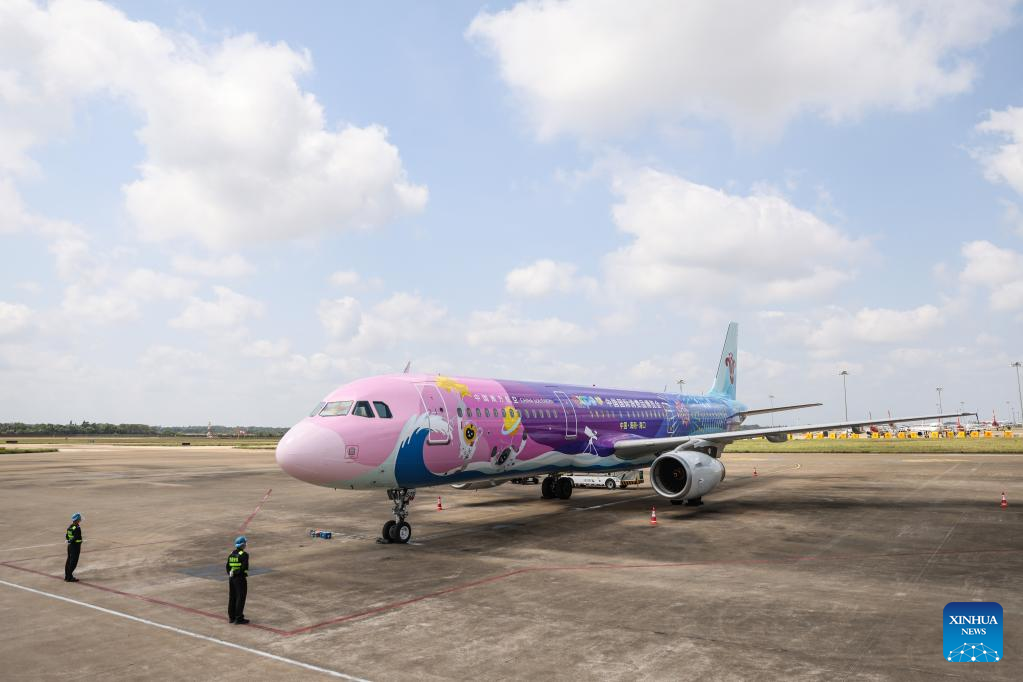 A plane painted with patterns of the China International Consumer Products Expo arrives at Meilan International Airport in Haikou, south China's Hainan Province, March 13, 2022. China Southern Airlines' aircraft themed with International Consumer Products Expo arrived in Haikou on Sunday, completing its maiden flight. (Xinhua/Zhang Liyun)