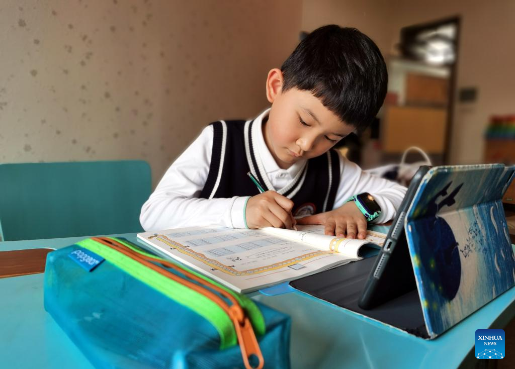 A pupil studies online at home in Shanghai, east China, March 14, 2022. Starting from Saturday, all primary and secondary schools in Shanghai have switched to online classes in response to latest rebound of COVID-19 cases. (Xinhua)