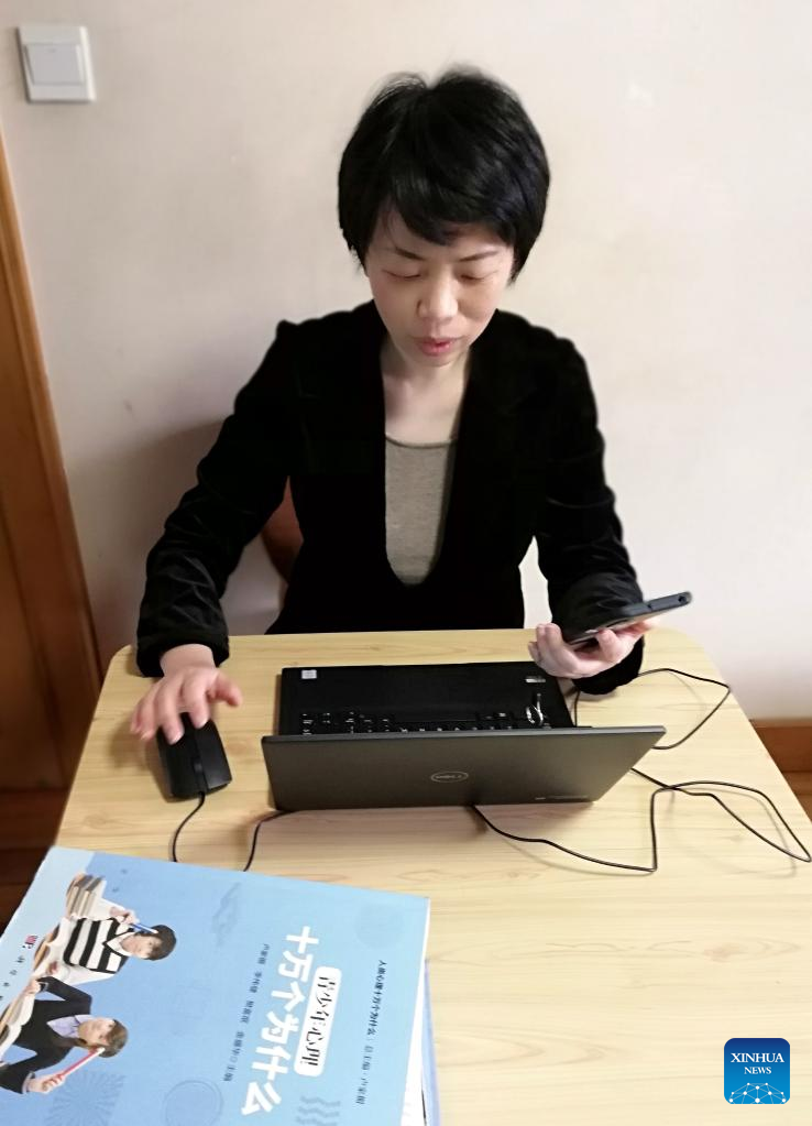 A psychology teacher records psychological consultation broadcasts for teachers, students and parents during the epidemic at a primary school in Shanghai, east China, March 14, 2022. Starting from Saturday, all primary and secondary schools in Shanghai have switched to online classes in response to latest rebound of COVID-19 cases. (Xinhua)