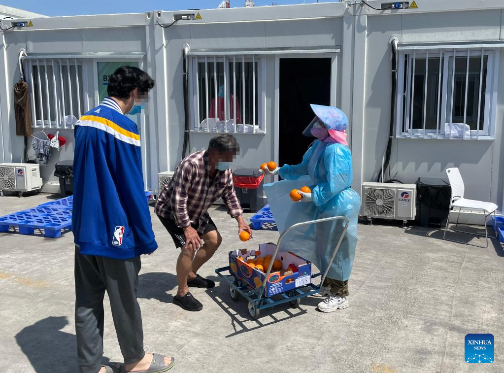 Photo taken with a mobile phone shows a medical staff member distributing fruits at a community isolation facility in south China's Hong Kong, March 12, 2022. (Xinhua)