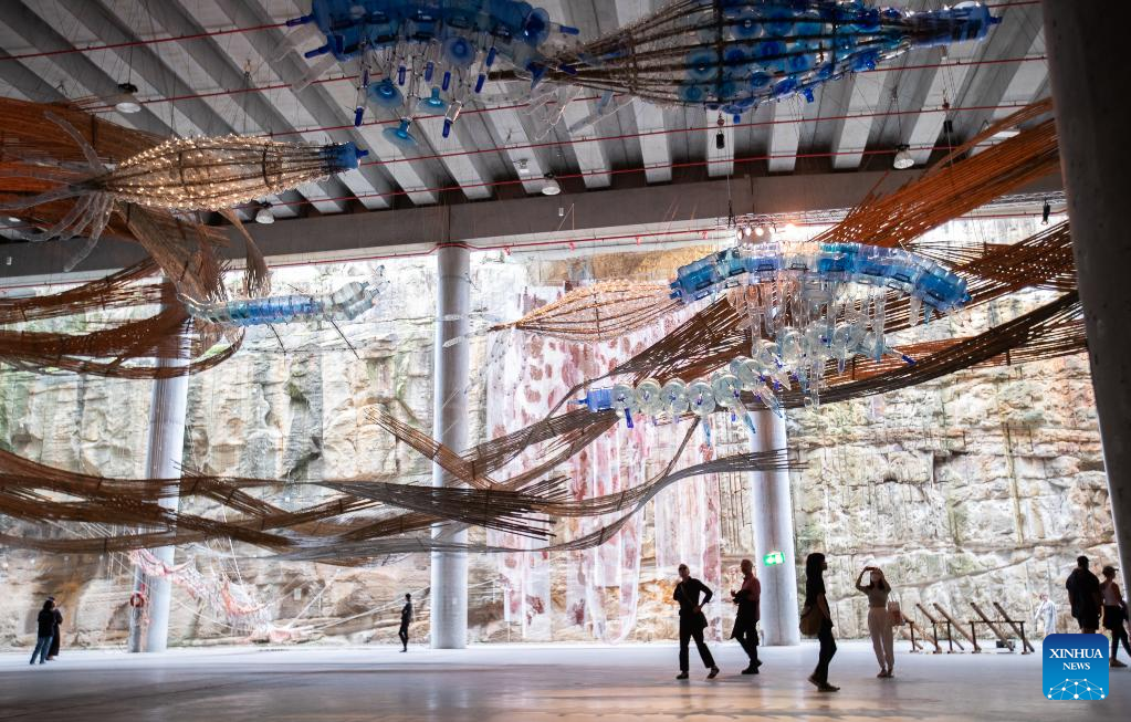 People visit Biennale of Sydney "rivus" at Art Gallery of New South Wales (NSW) in Sydney, Australia, on March 13, 2022. The 23rd Biennale of Sydney is held from March 12 to June 13, with more than 330 artworks by over 80 participants presented during the event. (Photo by Hu Jingchen/Xinhua)