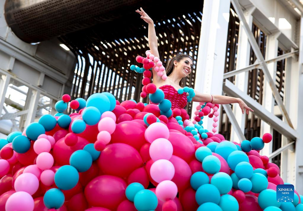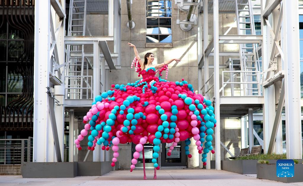 A woman dances in a balloon costume during the Creative Industries Expo at South by Southwest (SXSW) Conference and Festivals in Austin, Texas, the United States on March 13, 2022. The Creative Industries Expo at SXSW Conference and Festivals opened on March 13, featuring content aimed to promote discovery, education and inspiration. (Photo by Nick Wagner/Xinhua)