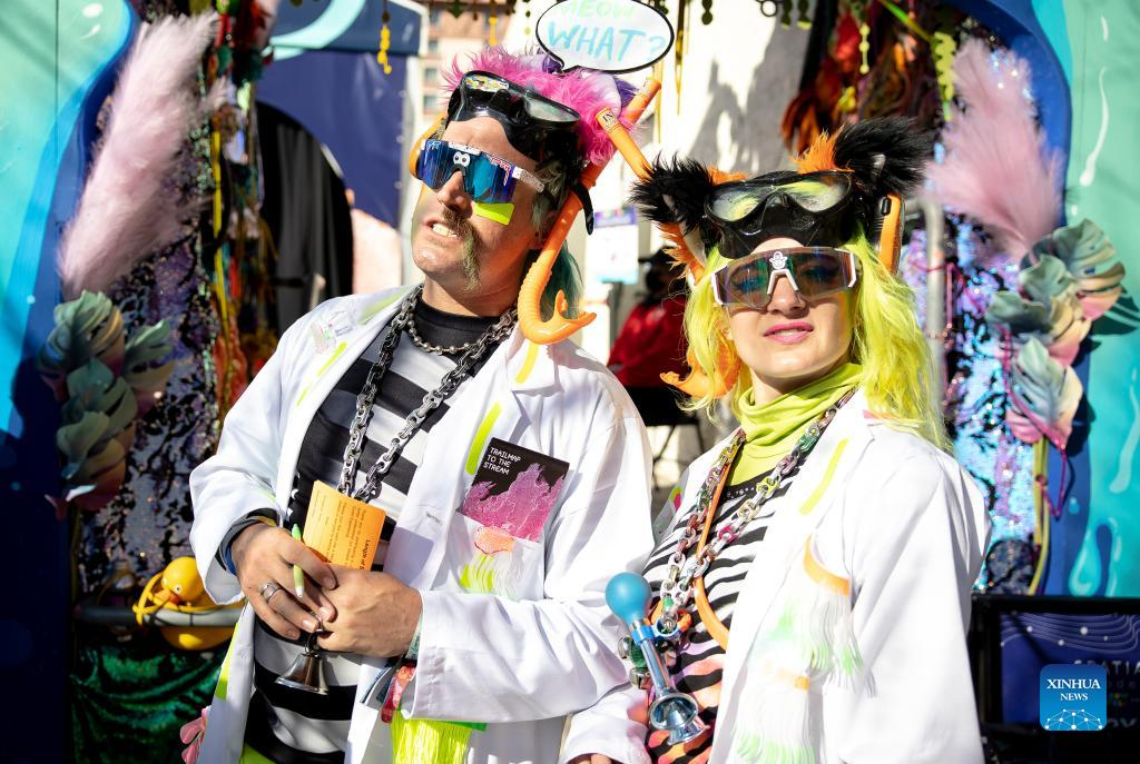 People dressed in costumes are seen during the Creative Industries Expo at South by Southwest (SXSW) Conference and Festivals in Austin, Texas, the United States on March 13, 2022. The Creative Industries Expo at SXSW Conference and Festivals opened on March 13, featuring content aimed to promote discovery, education and inspiration. (Photo by Nick Wagner/Xinhua)